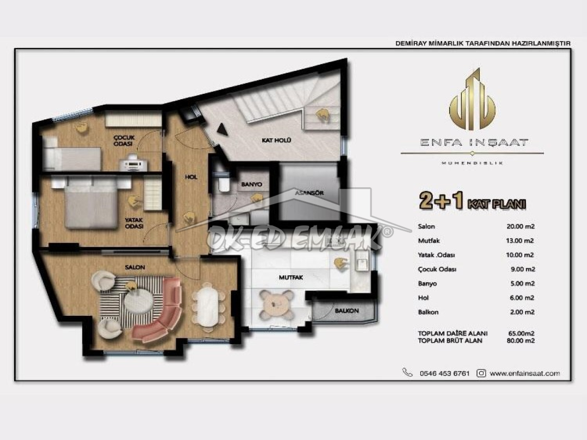 - 80 m² brüt, 65 m² net kullanım alanı